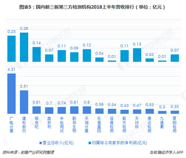 新三板企业中,2018上半年营收规模最大的依然是广电计量和建科股份,分别达到4.31亿元和2.51亿元。企业机构的营收规模和净利润均不足1亿元。