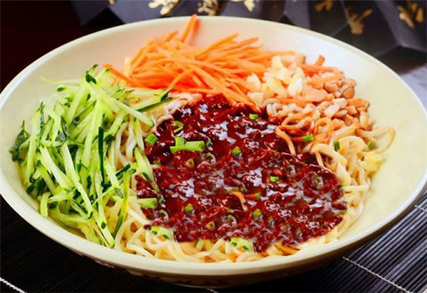 炸酱面是中国传统特色面食。被誉为“中国十大面条”之一,流行于北京、天津、山东、河北、辽宁、吉林等北方地区,由菜码、炸酱拌面条而成。将黄瓜、香椿、豆芽、青豆、黄豆切好或煮好,做成菜码备用。然后做炸酱,将肉丁及葱姜等放在油里炒,再加入黄豆制作的黄酱或甜面酱炸炒,即成炸酱。面条煮熟后,捞出,浇上炸酱,拌以菜码,即成炸酱面。也可根据自己的口味加辣椒、醋等调味品。这样会更加符合自己的口味。也有面条捞出后用凉水浸洗再加炸酱、菜码的,称“过水面”。