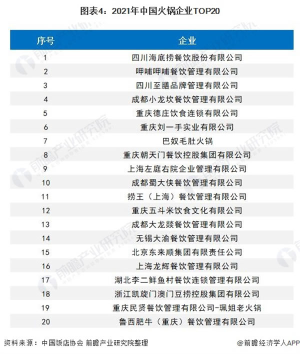 近日,中国饭店协会发布《2021中国餐饮业年度报告》,并发布火锅企业TOP20榜单,四川海底捞餐饮股份有限公司、呷哺呷哺餐饮管理有限公司、四川至膳品牌管理有限公司、成都小龙坎餐饮管理有限公司、重庆德庄饮食连锁有限公司、重庆刘一手实业有限公司、巴奴毛肚火锅有限公司、重庆朝天门餐饮控股集团有限公司、上海左庭右院企业管理有限公司、成都蜀大侠餐饮管理有限公司位列中国火锅品牌前十强。